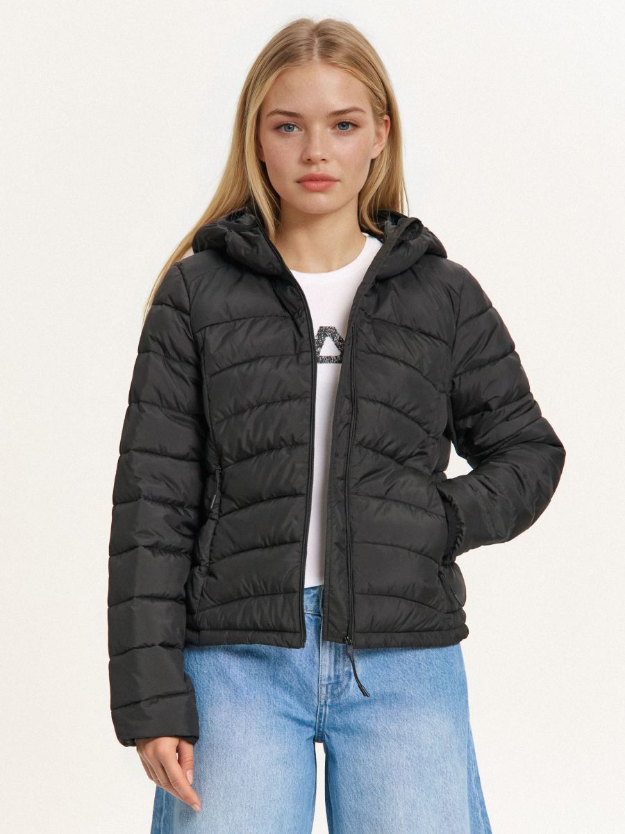 Prošivena crna jakna s kapuljačom