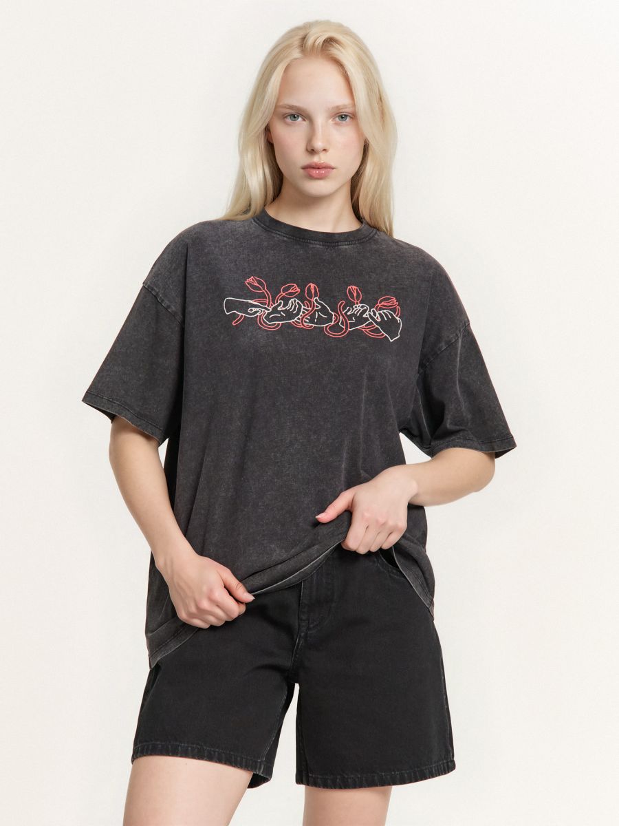Must laialõikeline trükisega T-särk