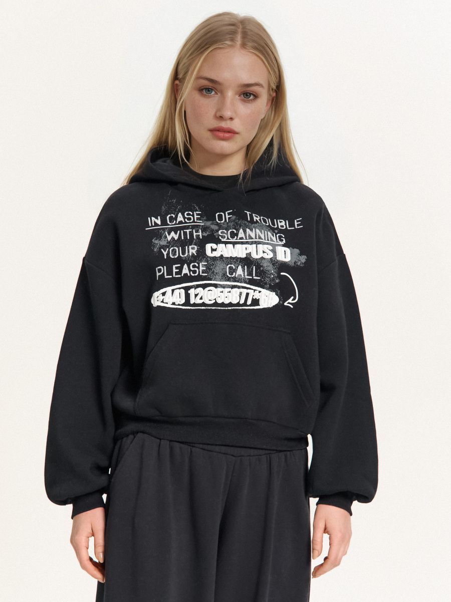 Črna pulover s kapuco in potiskom
