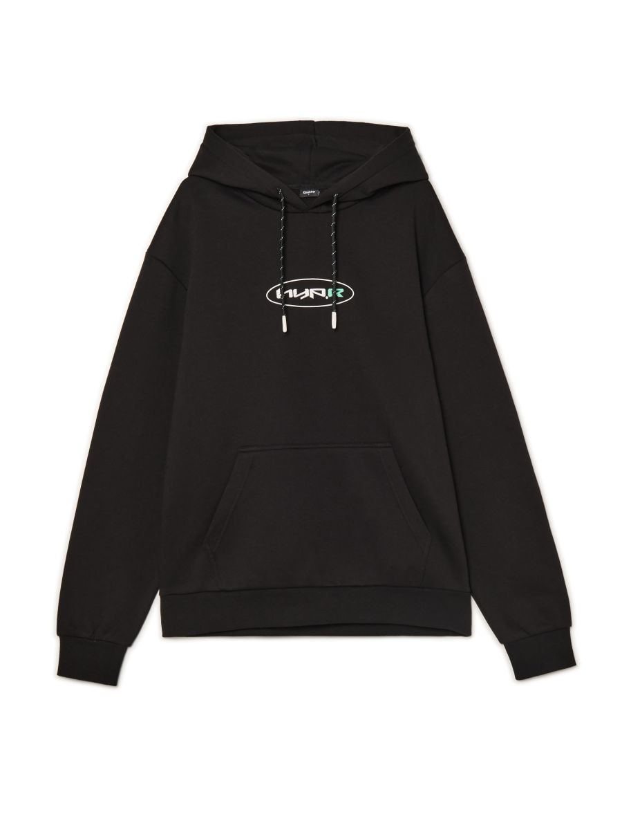 Črna pulover s kapuco in potiskom